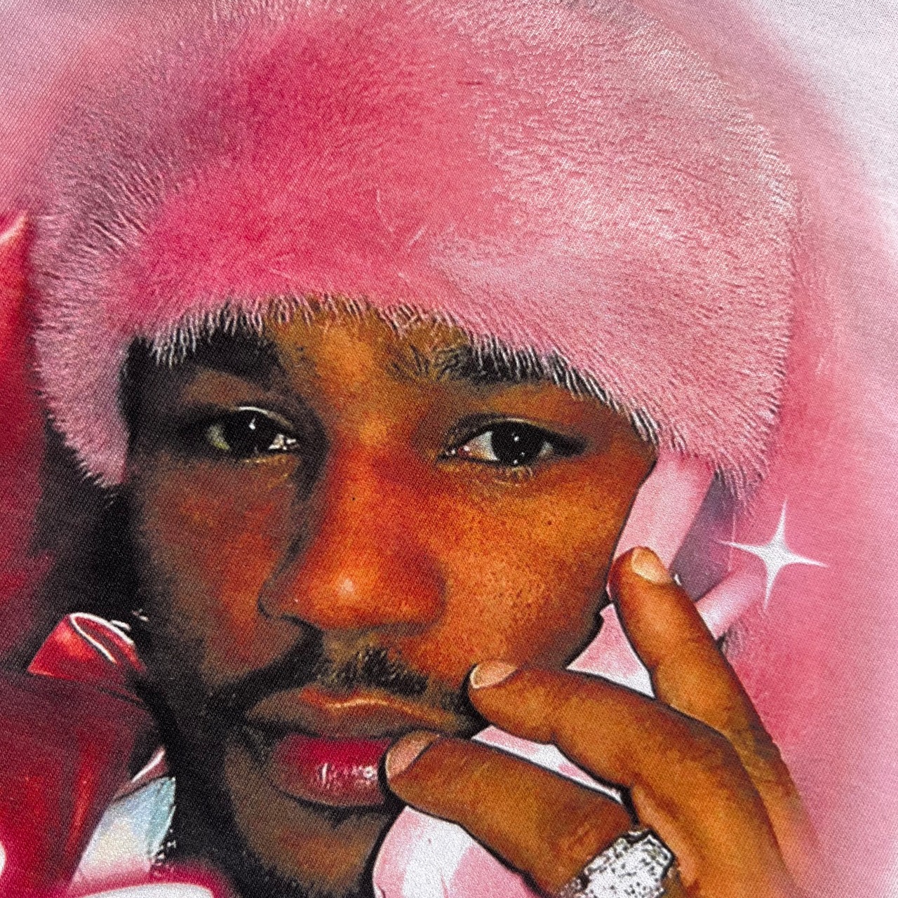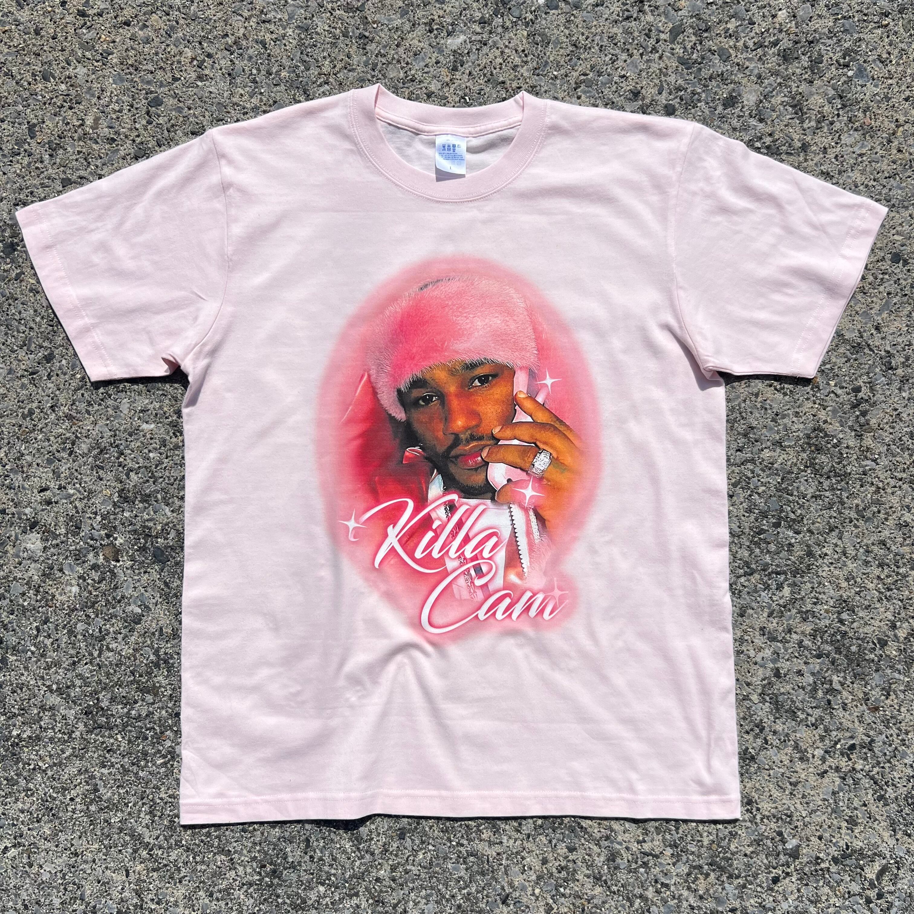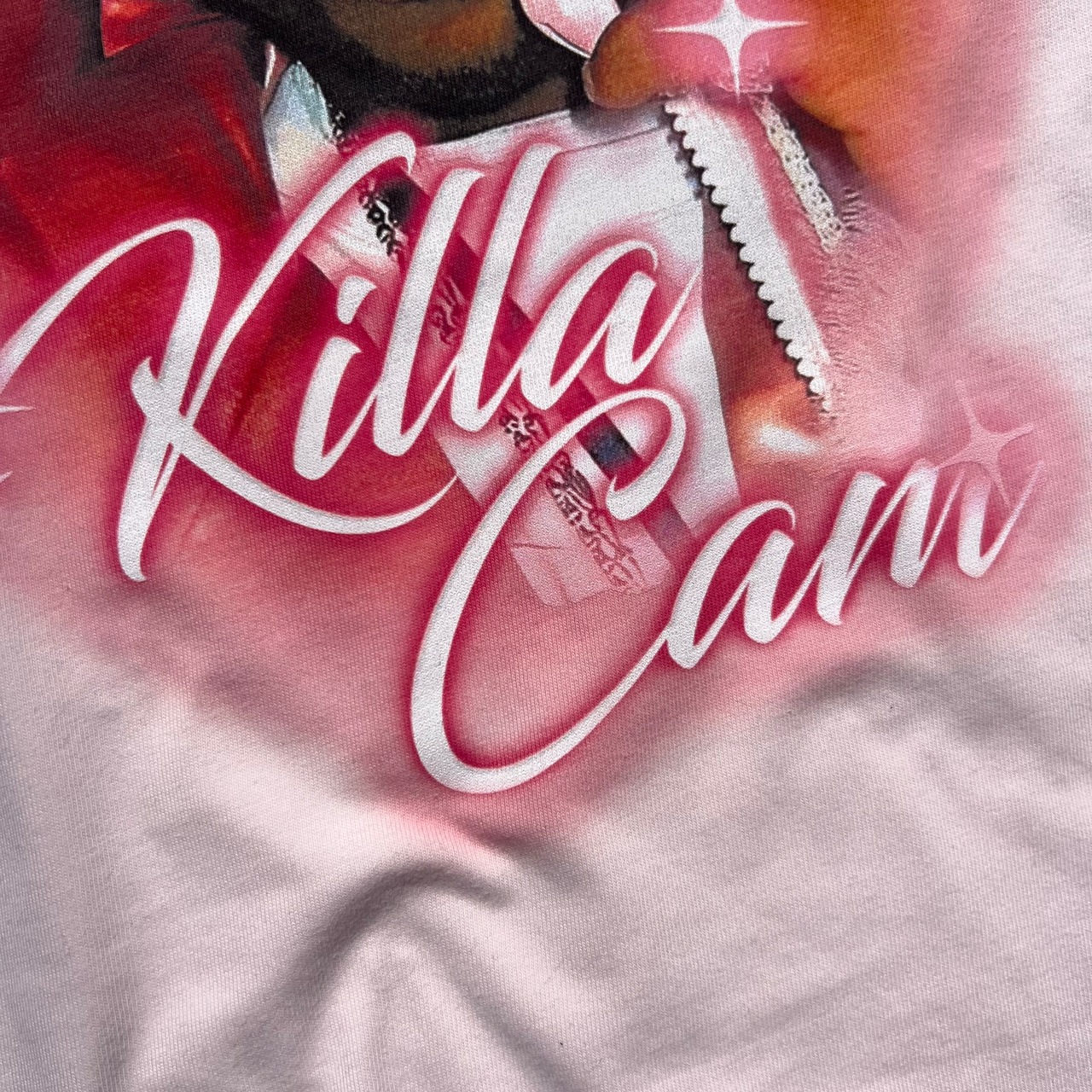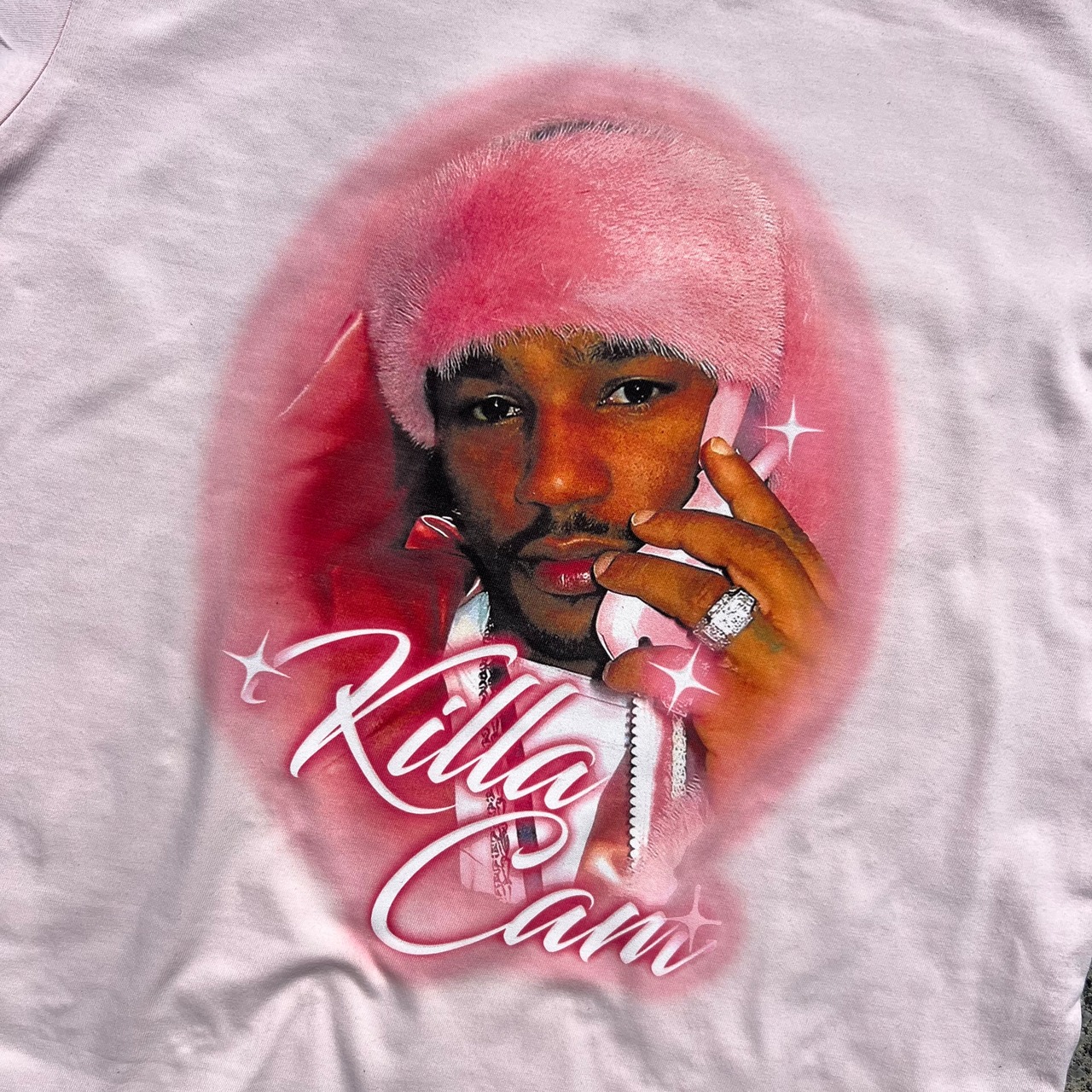 ピンクのガラパゴスケータイを片手に、ピンクのファージャケットを纏った有名なショットをピンクボディに大胆にプリント。デザイン下部には「Killa Cam」の文字。これはCam’ronの愛称であり、彼のスタイルとライフスタンスを象徴するフレーズです。