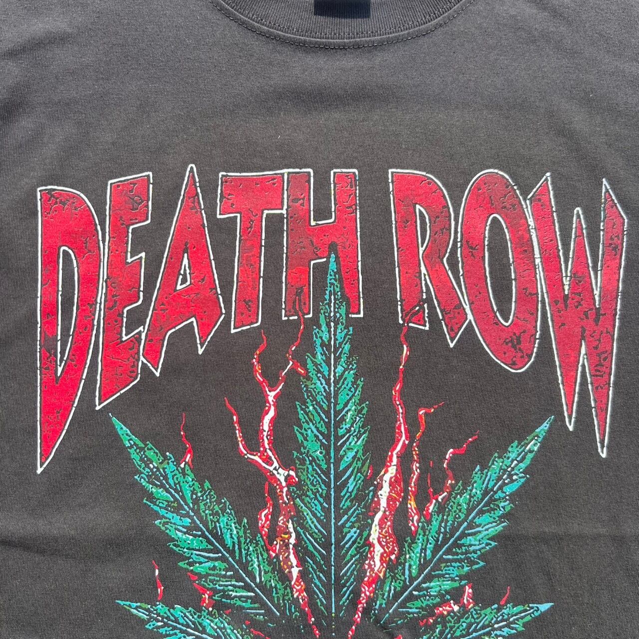 中央に描かれた燃え上がるリーフと三つのスカルは、DEATH ROWの持つ“死と再生”のシンボル。