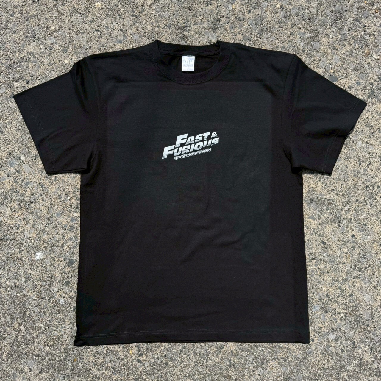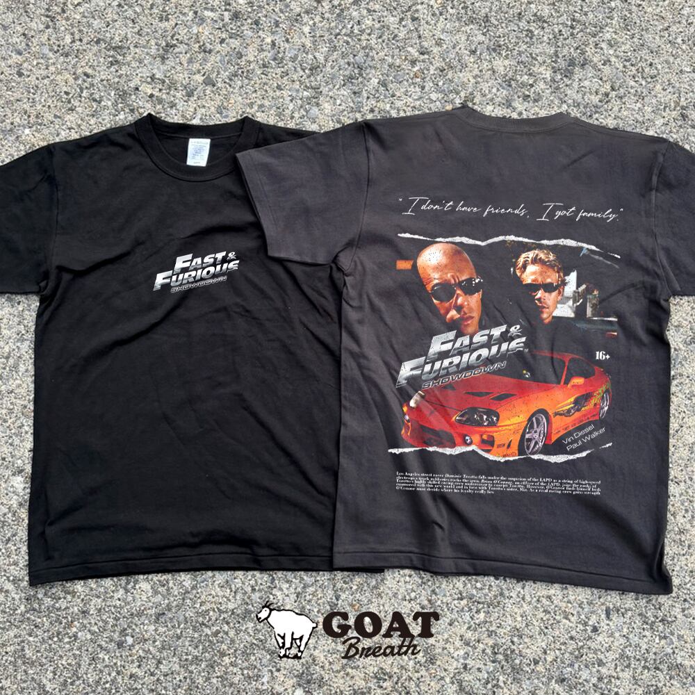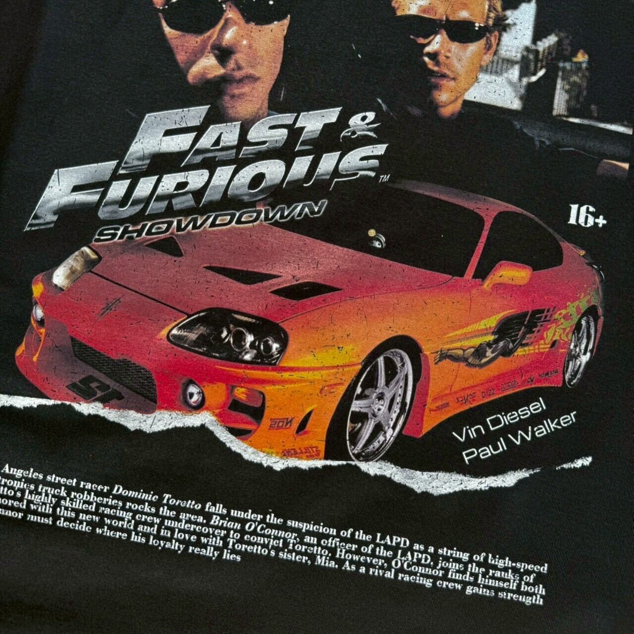 フロントはシンプルに「FAST & FURIOUS SHOWDOWN」のロゴを配置。バックにはヴィン・ディーゼルとポール・ウォーカー、そして名車スープラが大胆にプリントされたインパクト抜群のデザインです。