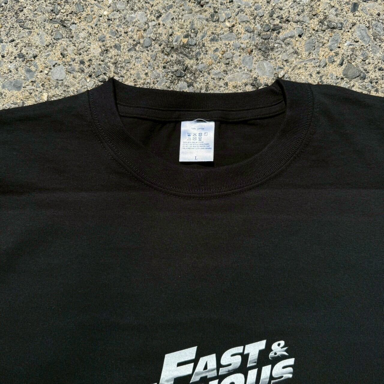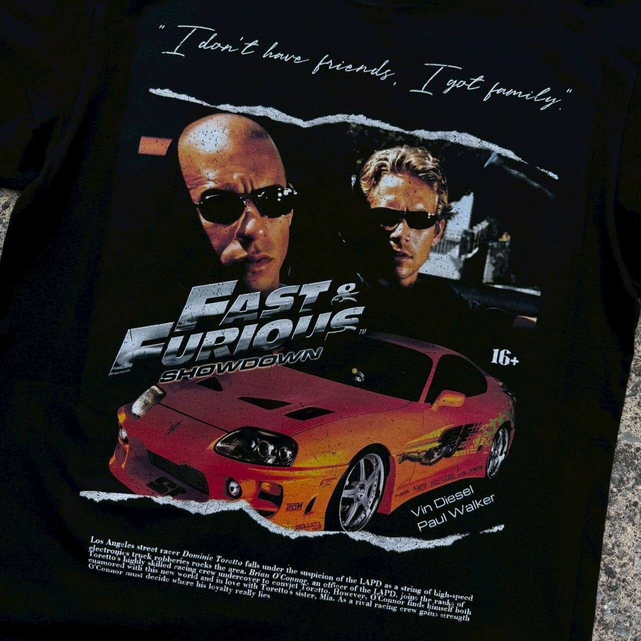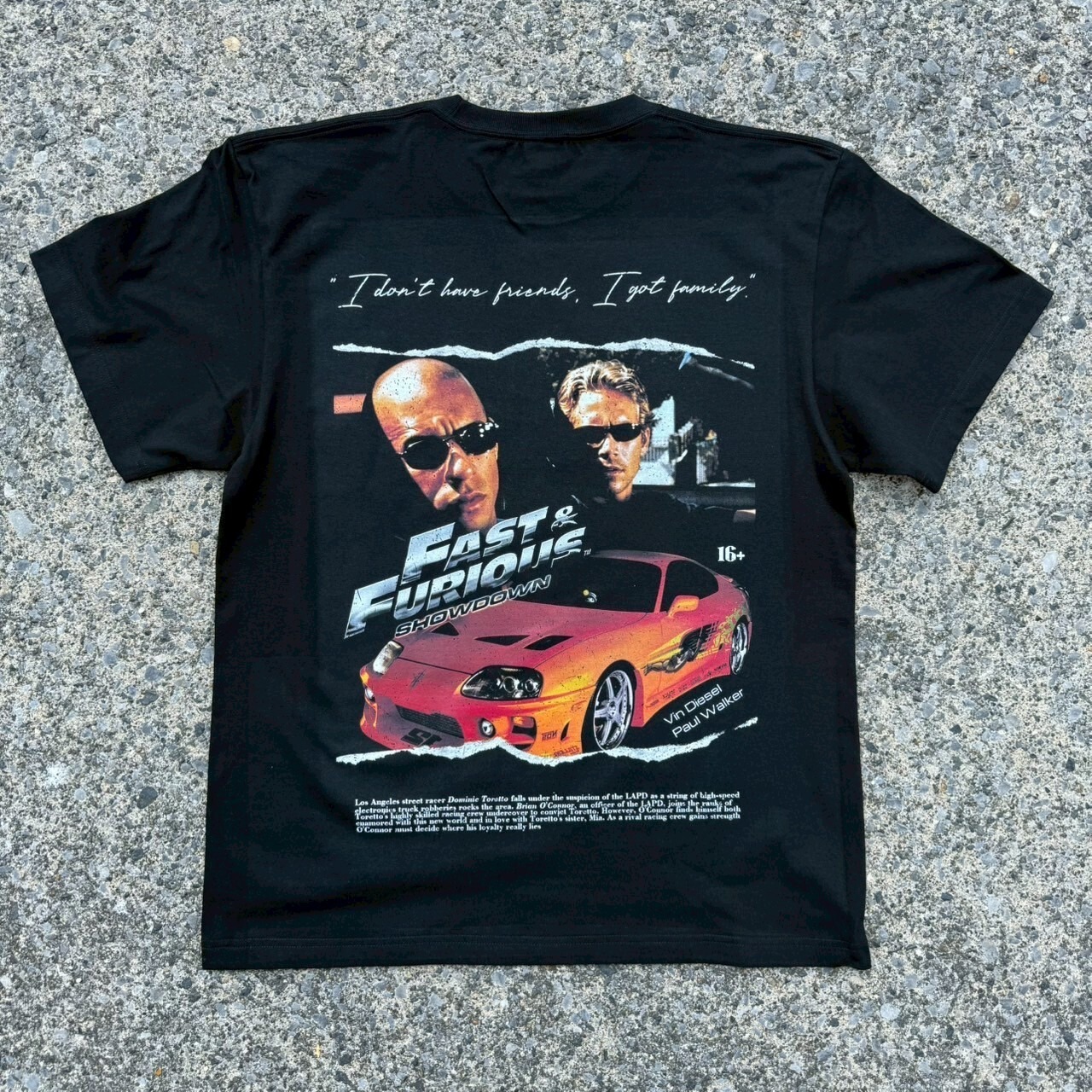フロントはシンプルに「FAST & FURIOUS SHOWDOWN」のロゴを配置。バックにはヴィン・ディーゼルとポール・ウォーカー、そして名車スープラが大胆にプリントされたインパクト抜群のデザインです。