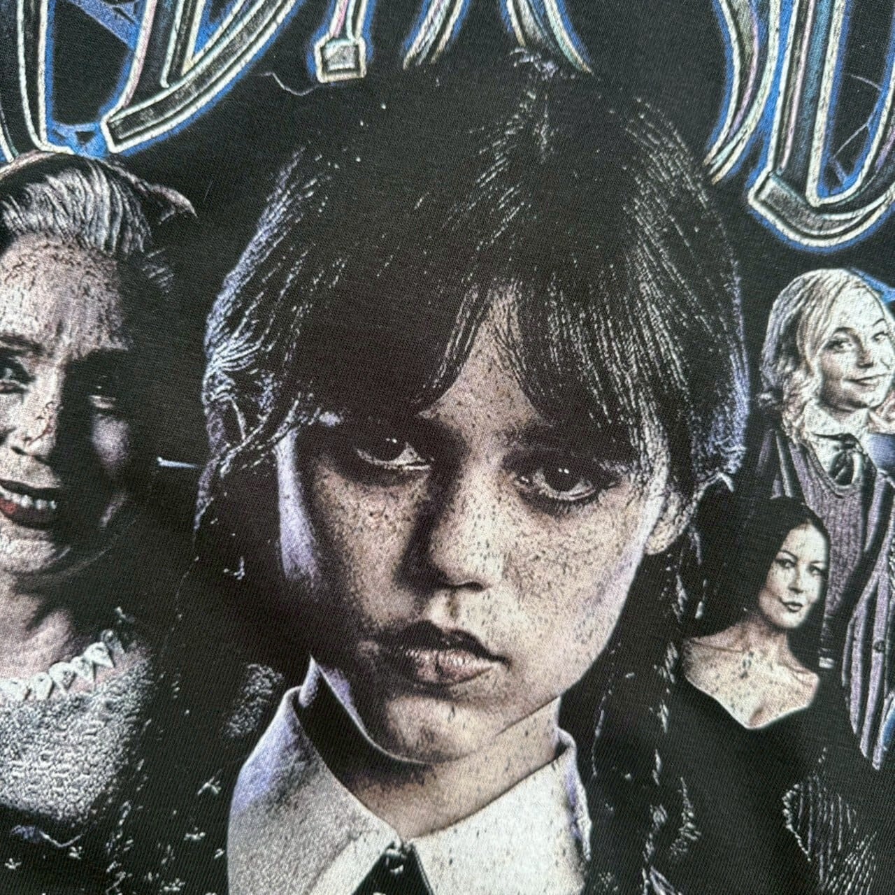 フロント中央には、冷たい視線で見る者を惹きつけるWednesday Addamsの姿。その周囲には、物語を支える個性的なキャラクターたちが並び、まるでドラマのワンシーンを切り取ったかのような重厚なデザインとなっています。さらに、下部には印象的な名場面を円形カットで配置。チェロを奏でる姿や独自の戦いのシーンが鮮やかに描かれています!
